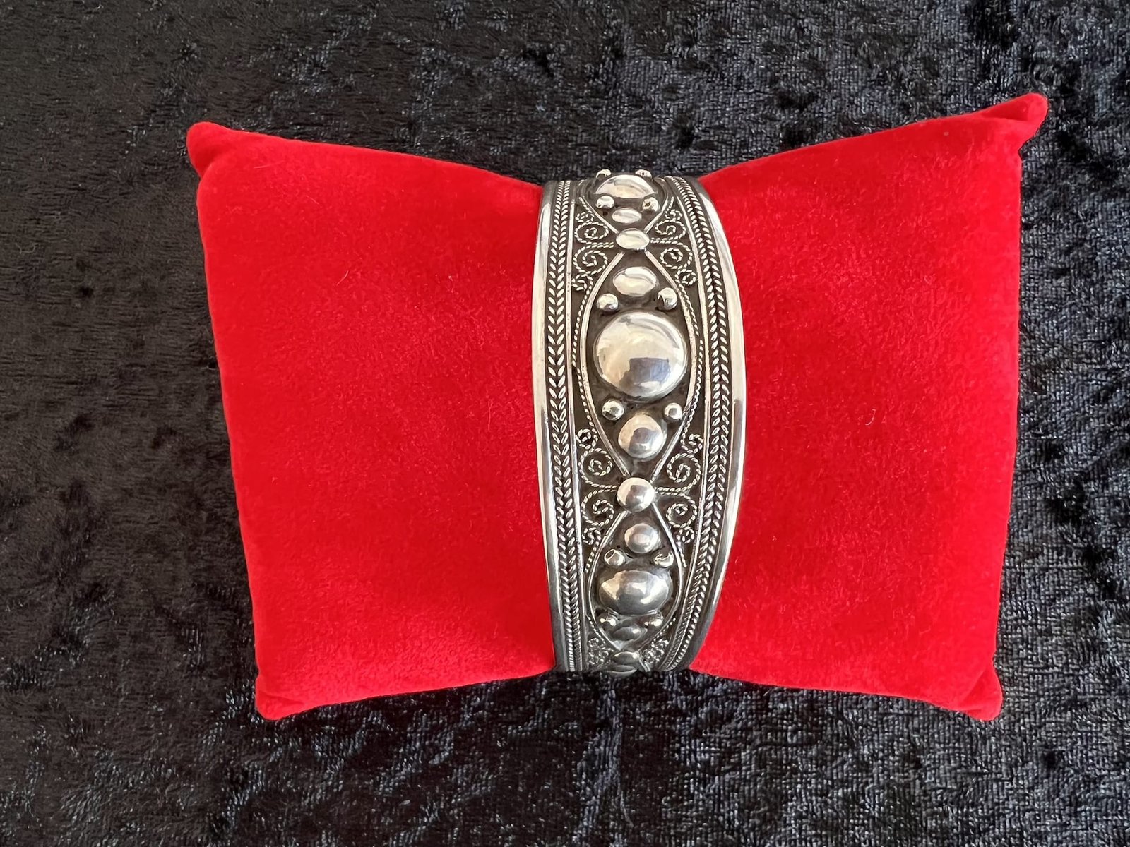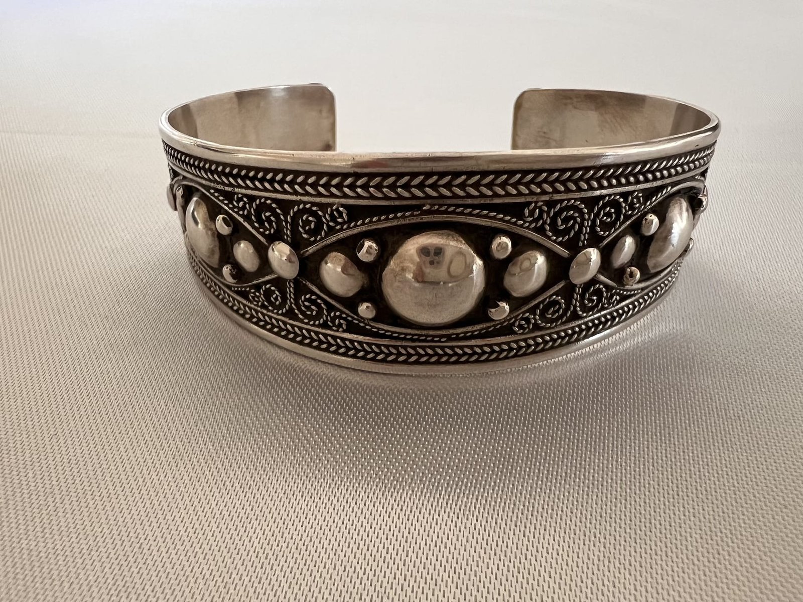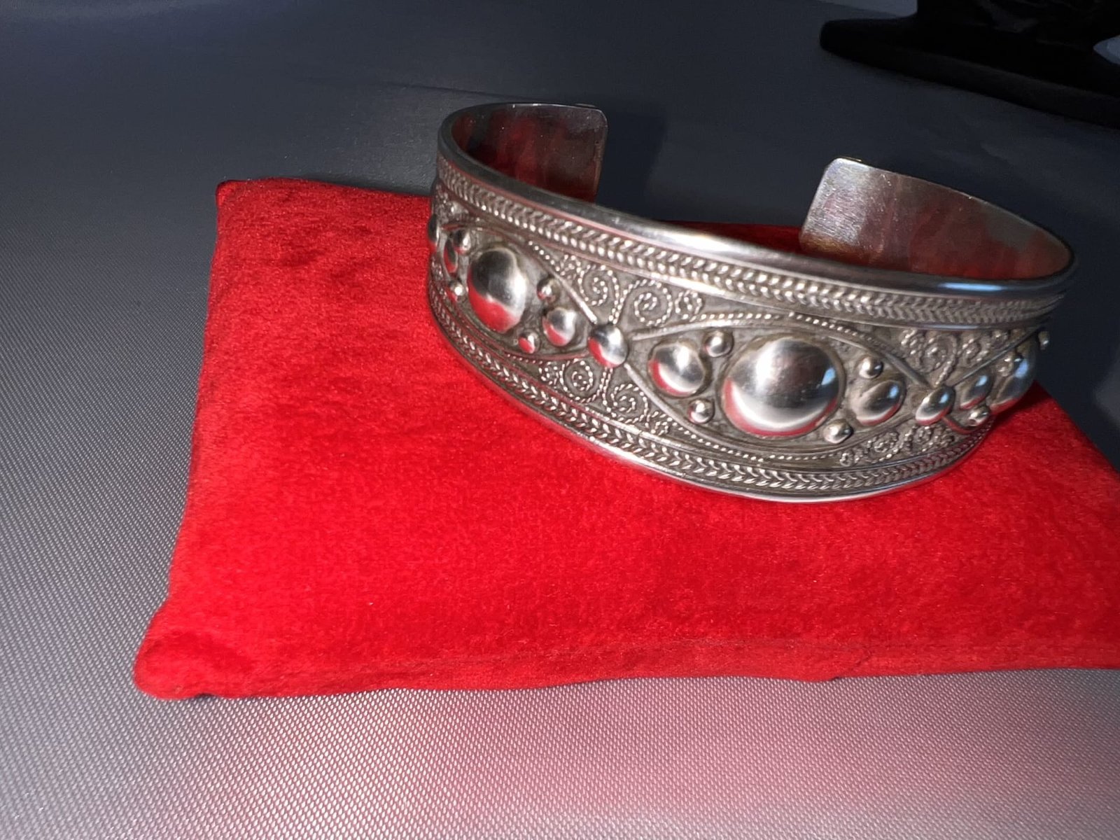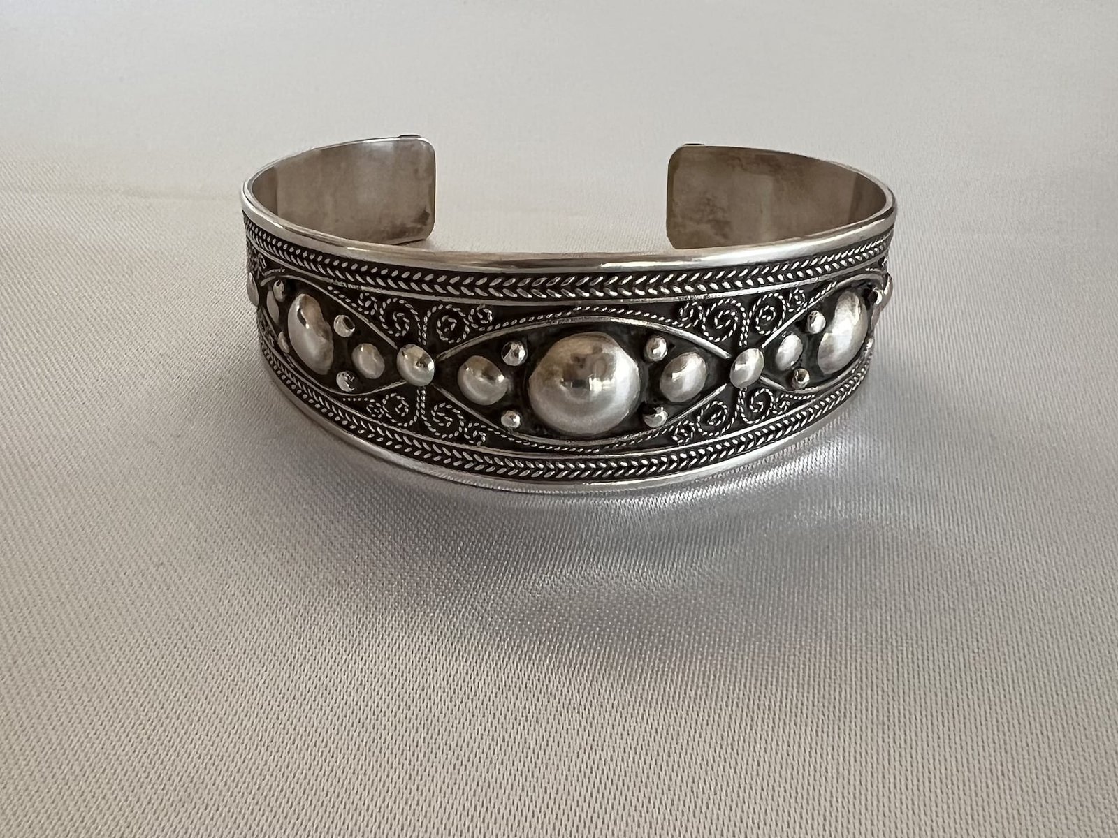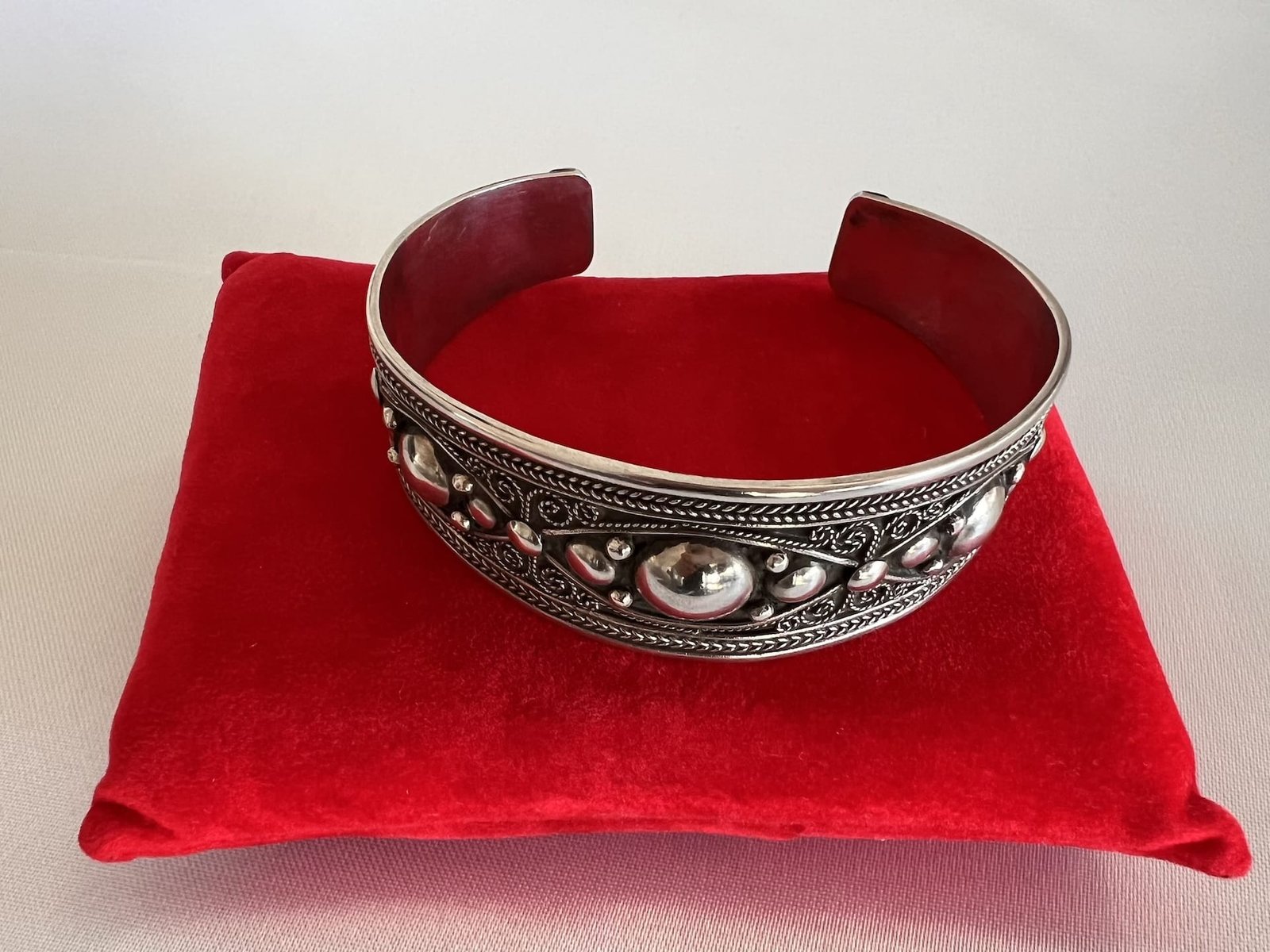 Dieser traditionelle Berber Armreifen aus echtem Silber wird in Marokko in kunstvoller Handarbeit gefertigt. Das fein gravierte Tuareg-Muster mit Silberperlen verleiht dem Schmuckstück seine besondere Ausstrahlung – zeitlos, authentisch und vielseitig kombinierbar.